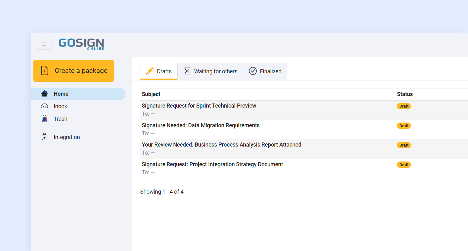 Meet GoSign.Online, a platform crafted to streamline document signing, ensuring a seamless, effortless, and user-friendly experience. This robust tool empowers you to generate documents and dispatch them for signatures with minimal effort. Whether utilized as a standalone platform or seamlessly integrated into any of your Every8.Cloud applications, GoSign.Online is designed to enhance your document signing process.